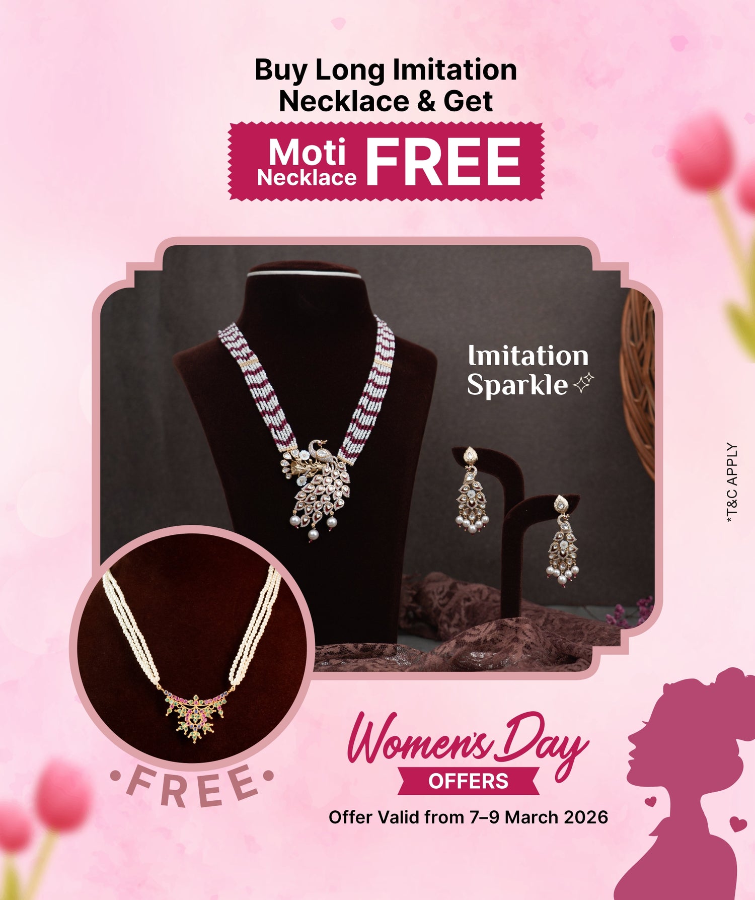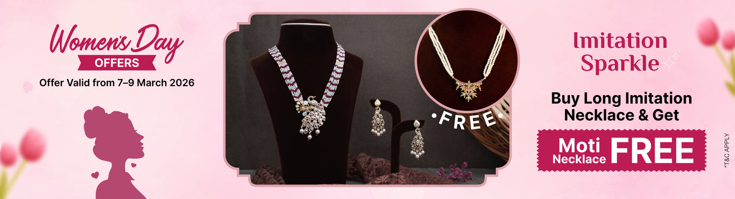 Add any Long Imitation Necklace and any Moti Necklace collection to your cart to get the Moti Necklace FREE.