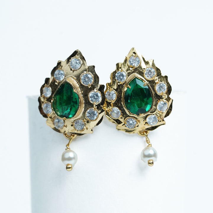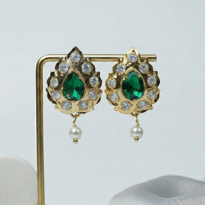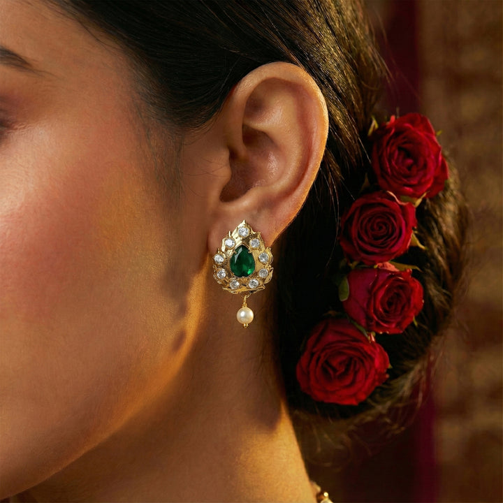 Gold-Plated Emerald Green Stone Stud Earrings with Pearl Drop