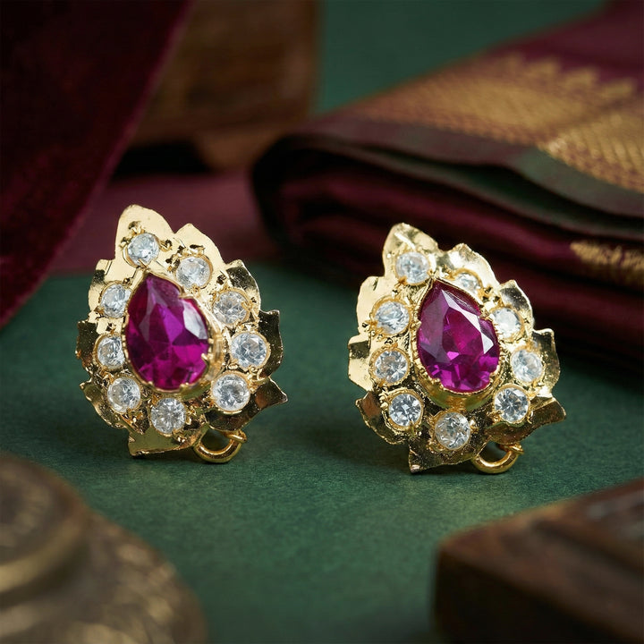 These Gold-Plated Tear Drop Pink Stone Stud Earrings by CRD Jewellers bring effortless elegance to both festive and everyday looks. Featuring a rich teardrop-shaped pink gemstone at the center, surrounded by sparkling diamond-like stones, this pair offers a perfect mix of shine and sophistication.