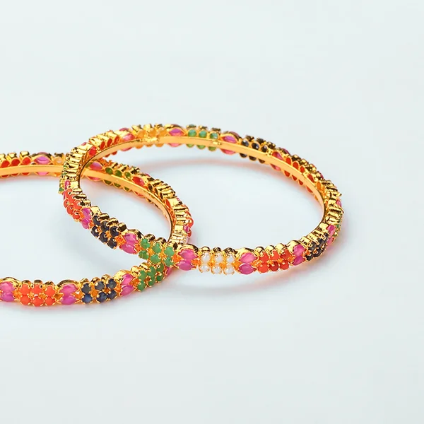 Elevate your traditional look with this vibrant multistone bangle, adorned with a rich combination of blue sapphire, pearl, ruby, coral, and emerald – all arranged beautifully across the top and extending to the sides for a fully embellished effect. The glossy finish adds a luxurious shine, while the colorful gemstones create a festive, royal appeal. This synthetic-stone bangle is ideal for weddings, poojas, or any celebration where you want your accessories to make a statement.