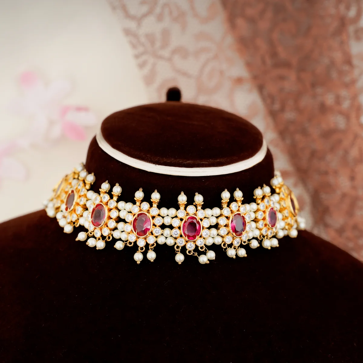 This statement piece features a broad, structured band designed to sit perfectly around the neck. The choker is detailed with a row of large, oval-cut ruby-red gems, each beautifully framed by a sparkling white stones and delicate golden accents. The entire bottom border is adorned with a rich fringe of small pearl (moti) clusters and drops. The set includes matching stud earrings that mirror the floral, ruby-centered design and pearl drops, creating a look of sheer traditional luxury. Perfect for a bridal trousseau or a magnificent formal event.