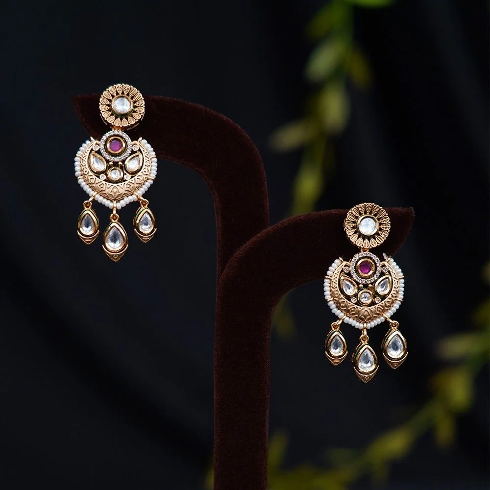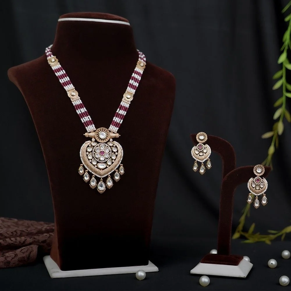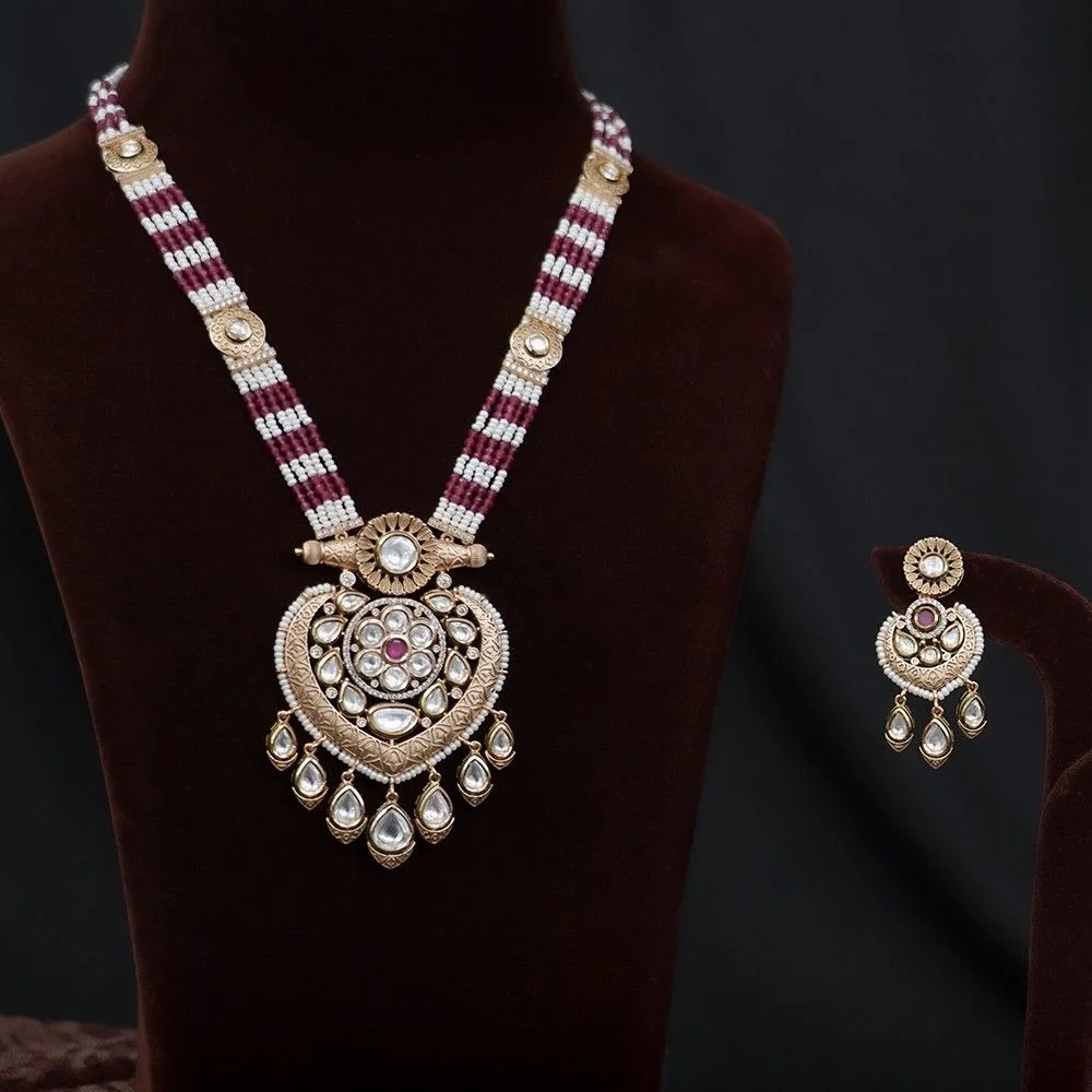 Radiate timeless elegance with the Noorani Pearl & Polki Set. This magnificent jewelry features a multi-strand choker-style crafted from beautiful, closely strung pearl beads (moti). The pendant showcases intricate metalwork, dazzling uncut Kundan stones, and a delicate drop of teardrop crystals. Paired with matching dangler earrings featuring a complementary half-moon and drop design, this set is a perfect choice for weddings, festive occasions, and traditional ceremonies.