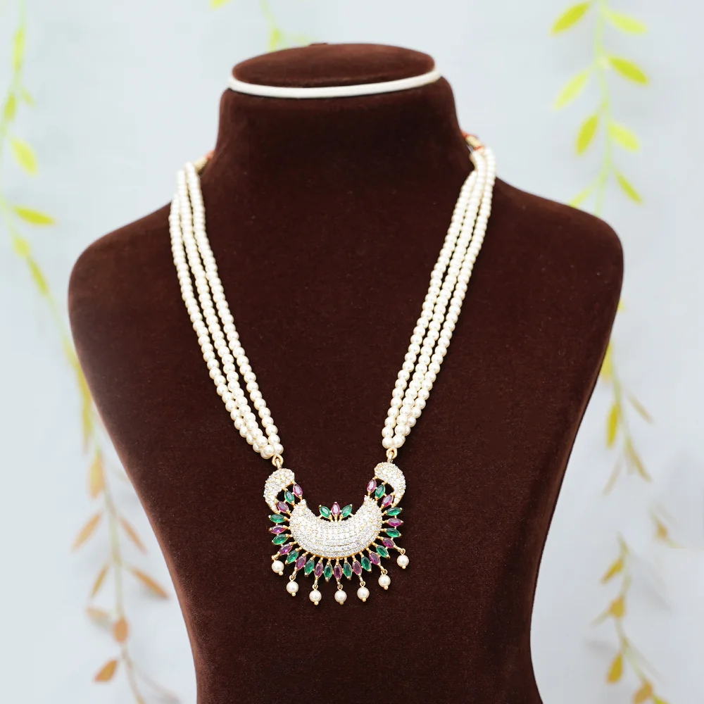 This elegant jewelry set features a necklace and matching earrings. The necklace is crafted with multiple strands of delicate pearls that lead to a beautiful, crescent-shaped pendant. The pendant is adorned with a vibrant green, pink, and white gemstones, along with dangling pearls, creating a design that evokes the fanned tail of a peacock. The earrings mirror this intricate design, with a cluster of matching gemstones and small pearls. The set combines traditional style with a touch of modern flair, making it suitable for special occasions.