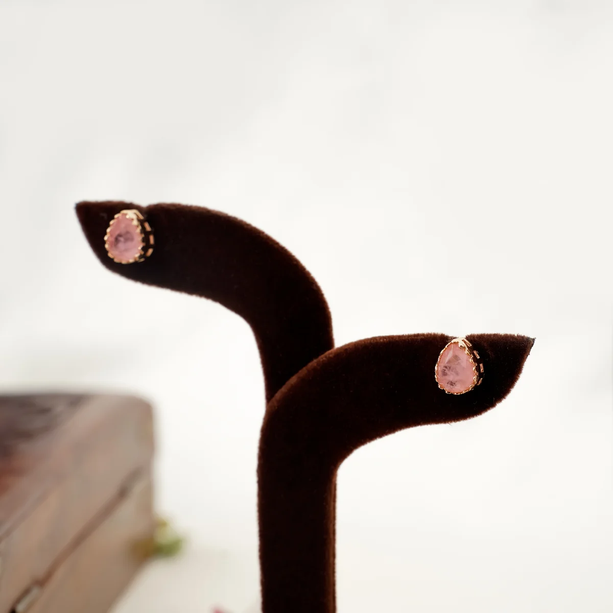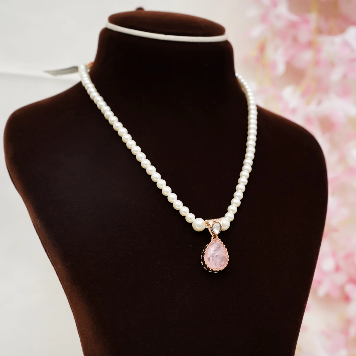 A picture of refined romance, the Rosewater Pearl Solitaire Set is designed for subtle elegance. The necklace features a graceful, single strand of creamy white pearls (moti) that rests gently on the collarbone. The centerpiece is a soft, blush-hued teardrop-cut gemstone, suspended from a delicate setting accented with small,stones. The included matching stud earrings complete the look with the same beautiful rose-gold-toned setting and center gem. This set is ideal for daily luxury, anniversaries, or complementing a formal gown with a touch of tender color.