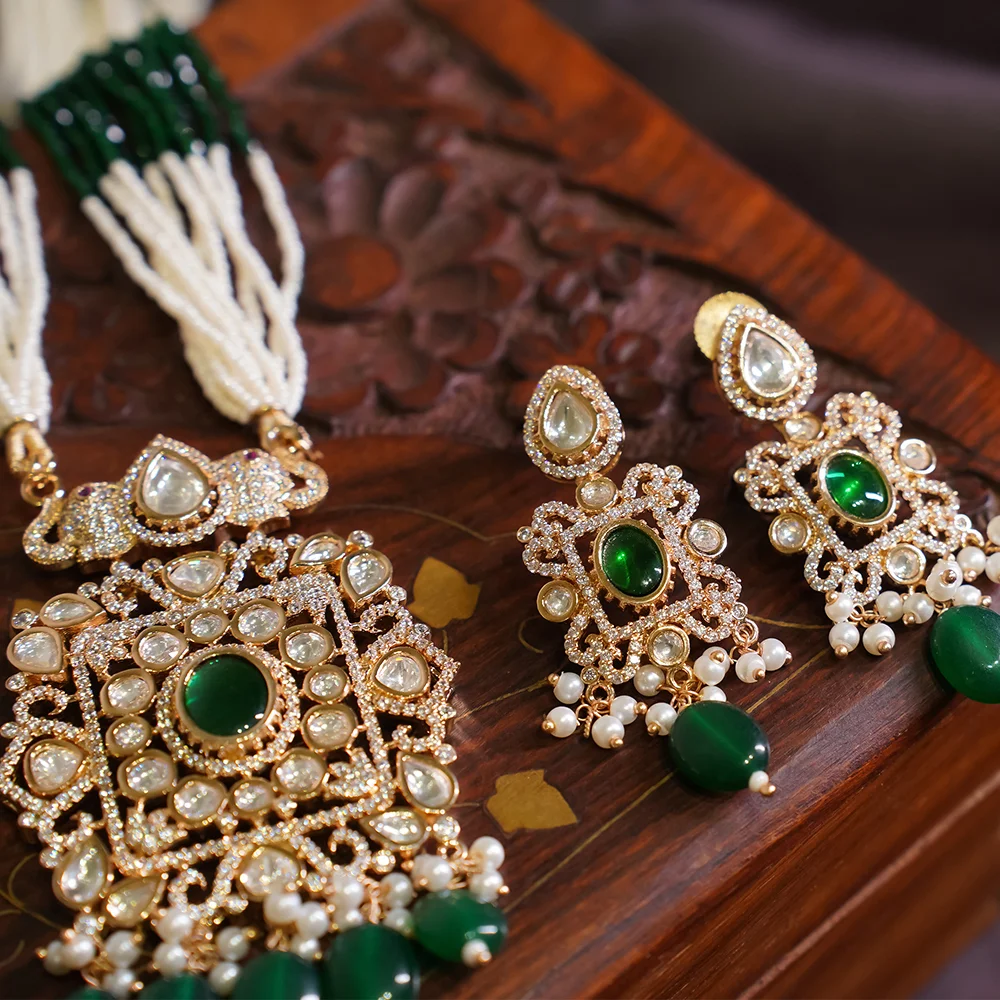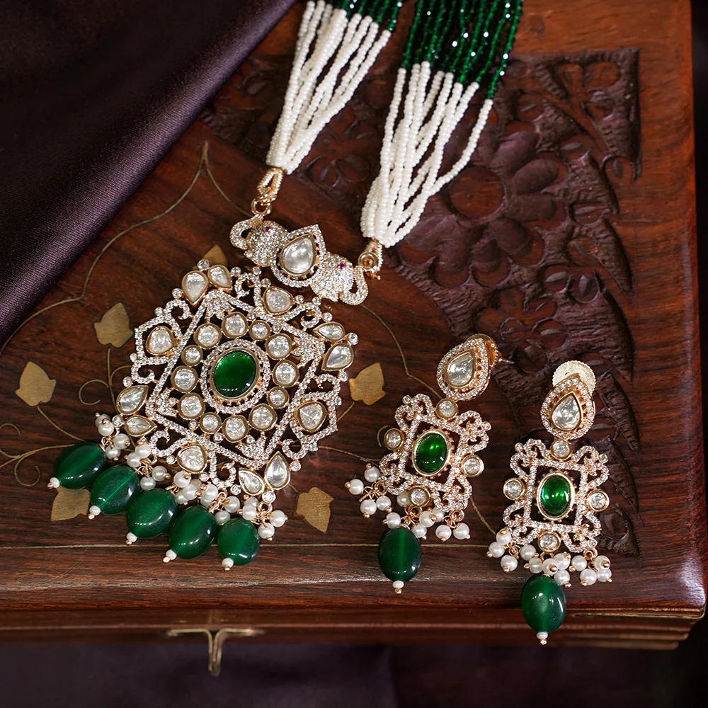 This jewelry set is a perfect example of traditional Indian craftsmanship. The necklace features strands of white and green beads, leading to a large, rectangular-shaped pendant. The pendant and earrings are intricately designed with a central large green stone, surrounded by sparkling white stones and smaller teardrop-shaped kundan stones. The bottom of the pendant and earrings is adorned with dangling green beads and small pearls. This set has a royal, traditional look perfect for weddings and formal events