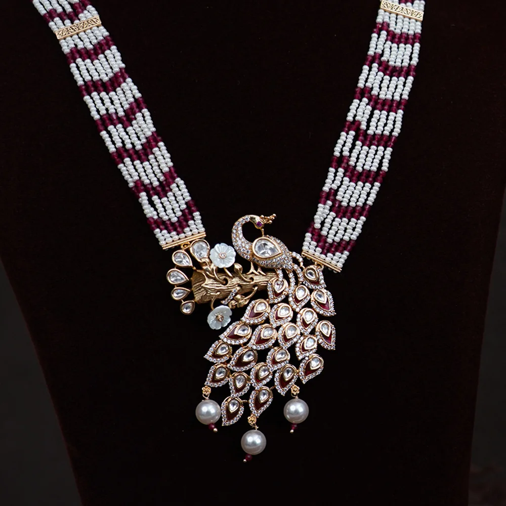 This exquisite jewelry set is a statement piece featuring a necklace and matching earrings. The necklace is strung with alternating strands of white pearls and maroon beads. A large, intricate pendant shaped like a majestic peacock is the centerpiece. The peacock's body and fanned tail are adorned with sparkling white stones and prominent teardrop-shaped kundan stones, while the bottom is finished with dangling pearls.
