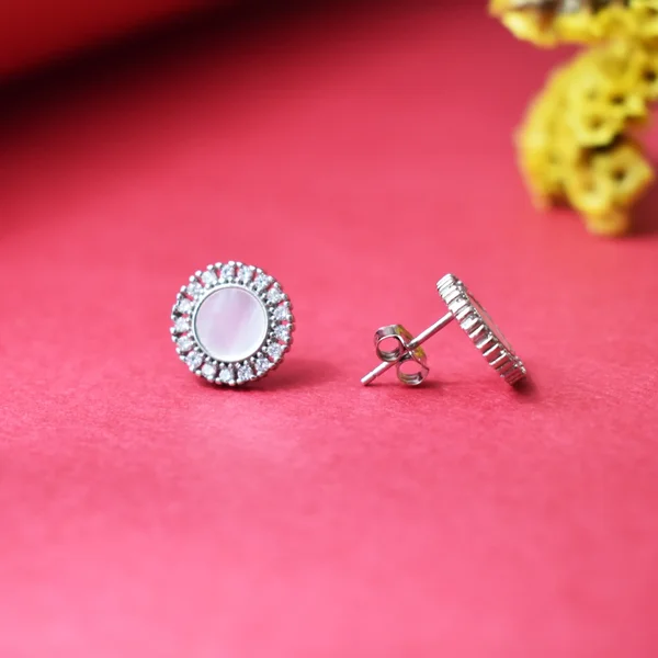Refined and radiant, these round earrings feature a luminous mother of pearl center encircled by a sparkling halo of diamond-like stones. The contrast of the soft sheen of pearl with the brilliance of diamonds makes this pair a classic choice. Perfect for special occasions or to elevate your everyday look with a touch of sophistication.