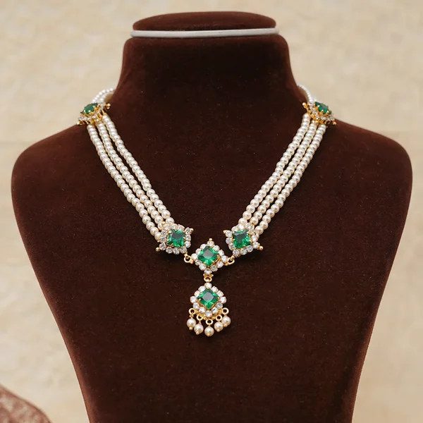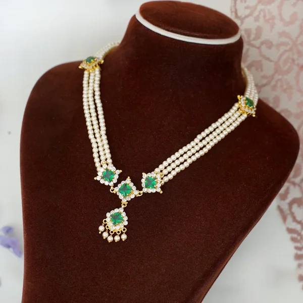 Elevate your style with this Elegant Moti Tanmani Necklace, a perfect blend of tradition and trend. Featuring three strands of lustrous pearls (moti), this affordable jewellery piece is adorned with vibrant emerald-green gemstones set in intricate gold detailing, creating a timeless yet trendy look. Ideal for budget-conscious shoppers and trendsetters, this necklace adds a touch of sophistication to any outfit, from casual chic to festive elegance. Whether you're attending a wedding or a party, this moti jewellery piece ensures you shine without breaking the bank. Pair it with your favorite ethnic wear or modern ensemble for a stunning statement. Shop now for affordable jewellery that combines elegance and style in one exquisite necklace!