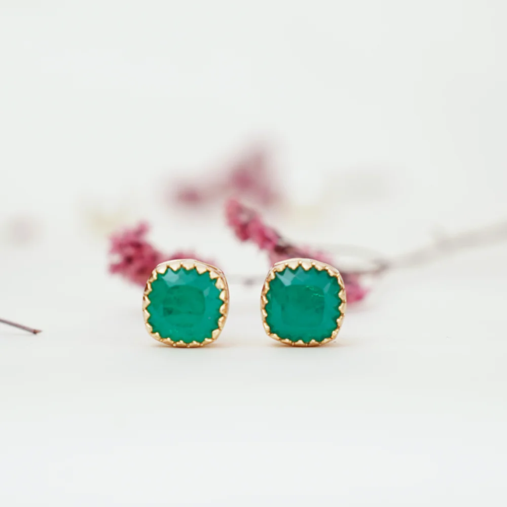 These elegant stud earrings feature a cushion-cut emerald green gemstone set in a gold-toned frame with a delicate scalloped edge. The rich green color and classic design make them perfect for adding a touch of color to any outfit, whether for everyday wear or special occasions.