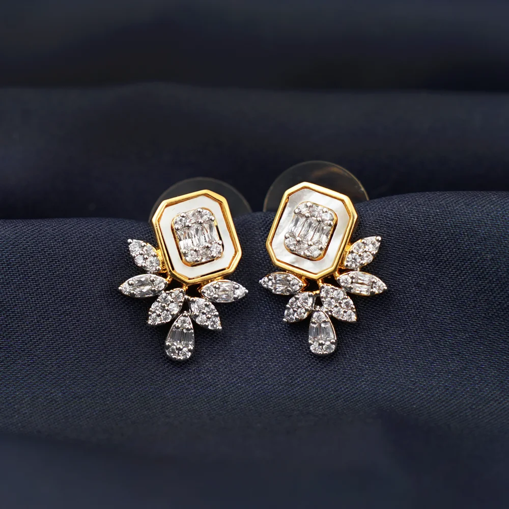 These elegant earrings have a stylish design with a rectangular top framed in gold tone, holding a smooth white mother-of-pearl inlay. At the center of the rectangle is a cluster of sparkling white stones. Below, a teardrop-shaped stones creates a delicate floral or leafy pattern. The mix of classic white and gold with the modern geometric and floral design makes these earrings perfect for formal occasions or special events.