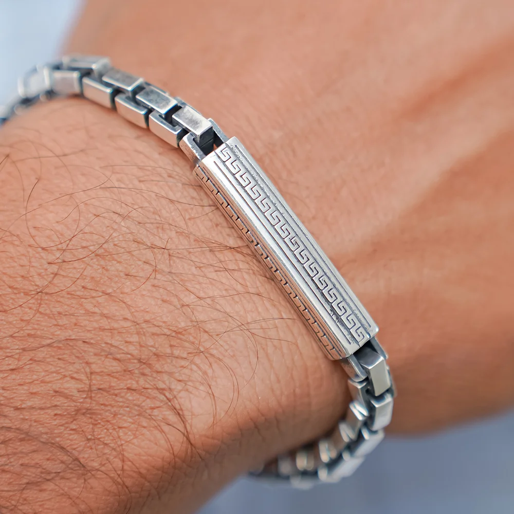 A modern, masculine bracelet featuring interlocking box chain links. The central element is a long, rectangular ID plate with intricate Greek Key or geometric engraving. It has a smooth, polished silver finish.