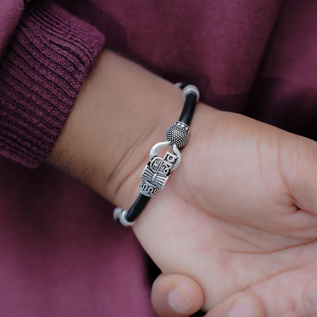 This striking bracelet blends spiritual meaning with a rugged, contemporary aesthetic, making it perfect for daily wear. The foundation is a thick, smooth black cord leather that provides a durable and comfortable fit. The key feature is the trio of oxidized silver-tone metal centered on the cord.The focal point is a distinctive barrel-shaped clasp that appears to feature engraved Devanagari script or a sacred symbol, 'Om'.