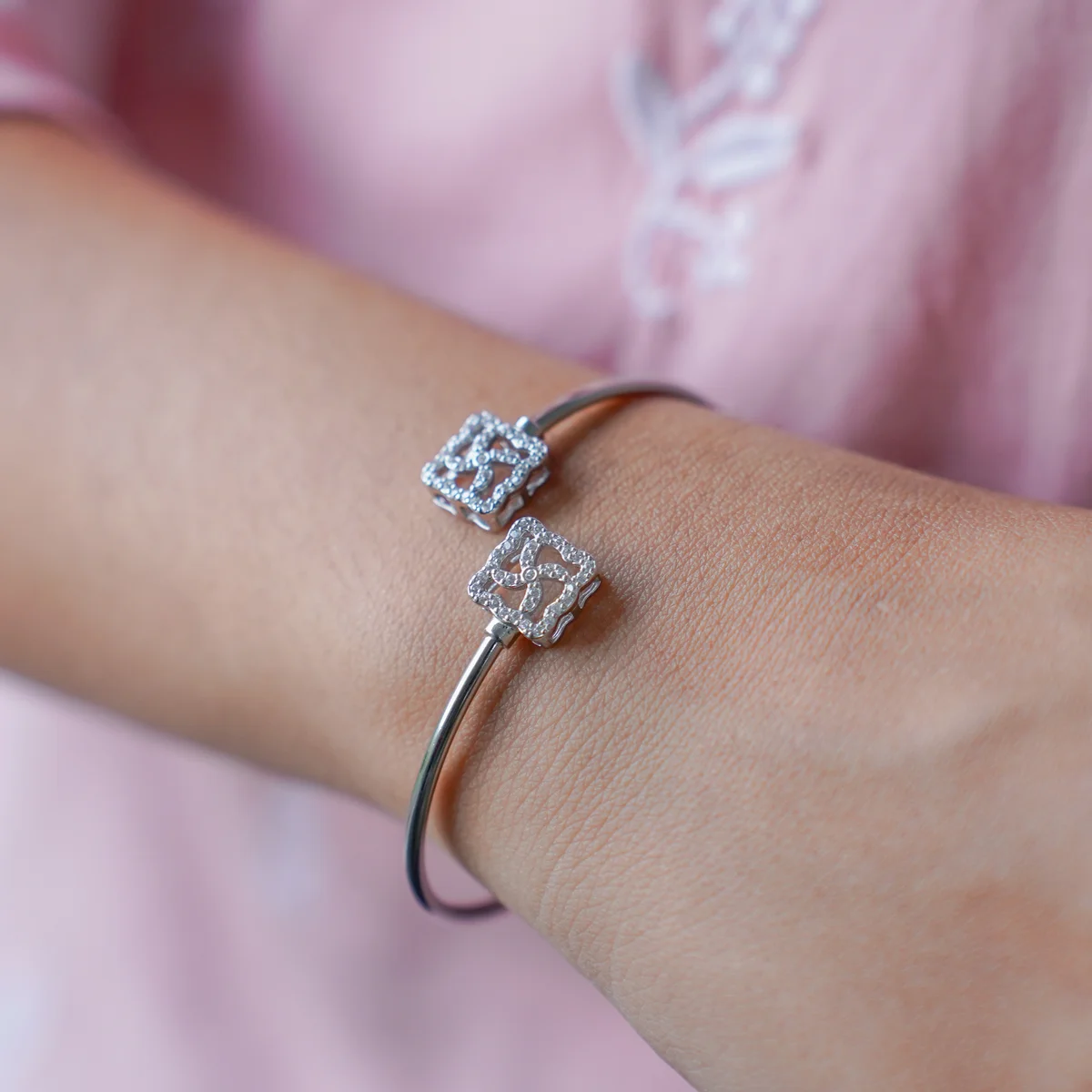 This sleek, polished cuff features a metal band finished with two bold, square finials. Each square is defined by a border of diamond accents and an intricate, openwork design at the center. The combination of clean lines and delicate pattern creates a dynamic and luxurious accessory, perfect for the modern woman who loves architectural jewelry.