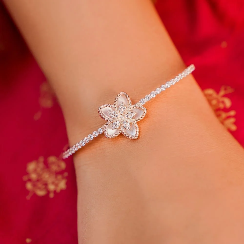 The Silver – Pearl Blossom Bracelet is an elegant and delicate piece of jewelry made from 92.5 silver with a polished white gold finish. It has a soft, graceful shine that adds a touch of sophistication to any outfit. At the center of the bracelet is a beautiful flower design, with petals made from luminous mother of pearl. The glow of the pearl gives the bracelet a gentle beauty. Its delicate design makes it perfect for special occasions or for adding a subtle elegance to everyday wear.