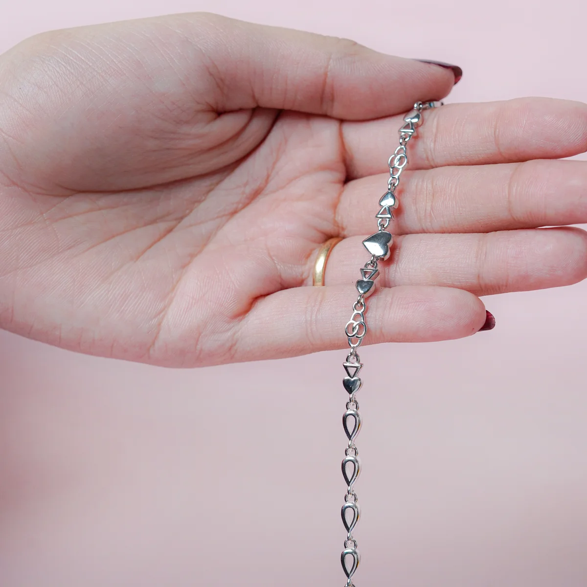 Delicate yet striking, the Silver Love Geometry Bracelet beautifully blends modern minimalism with a hint of romance. Crafted in premium silver finish, this bracelet features alternating heart and geometric motifs, symbolizing balance, love, and individuality. Its sleek design makes it perfect for daily wear or as an elegant accent for special occasions.