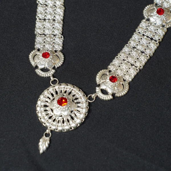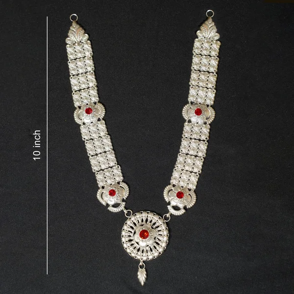 Add a royal touch to your traditional look with this handcrafted Silver Haar. Designed with intricate floral patterns and adorned with vibrant red stones, this haar beautifully blends elegance with devotion. Measuring 10 inches in length, it features a circular pendant centerpiece with dangling detail, making it ideal for temple wear, festive occasions, or deity decoration. Its fine craftsmanship and antique silver polish make it a timeless treasure for your jewelry collection. Material: Silver finish Length: 10 inches Design: Floral motifs with red stone embellishments Ideal for: Festivals, weddings, deity adornment, and special occasions