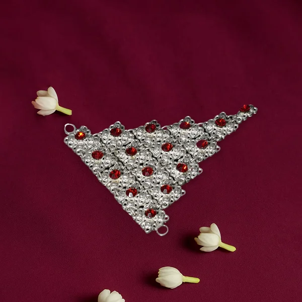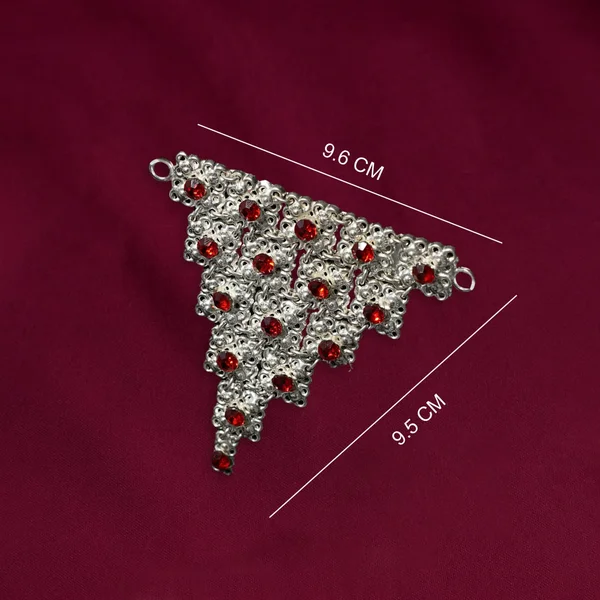 Enhance your ethnic look with this beautifully handcrafted silver tikli sond, adorned with vibrant red stones. Measuring 9.6 cm by 9.5 cm, it’s perfect for weddings, cultural events, and festive occasions. A timeless blend of tradition and elegance, this tikli pendant adds charm and sophistication to your jewellery collection.