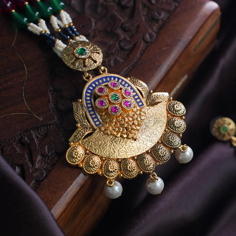 Celebrate artistry and tradition with this elegant Enamel Peacock Pendant Set, crafted in a graceful silver finish. The necklace is strung with alternating green and white beads, adding a fresh and vibrant touch. At its heart lies a large rounded silver-toned pendant, richly textured and adorned with an arched design of deep blue enamel and multi-colored gemstones, evoking the beauty of a peacock in full glory.