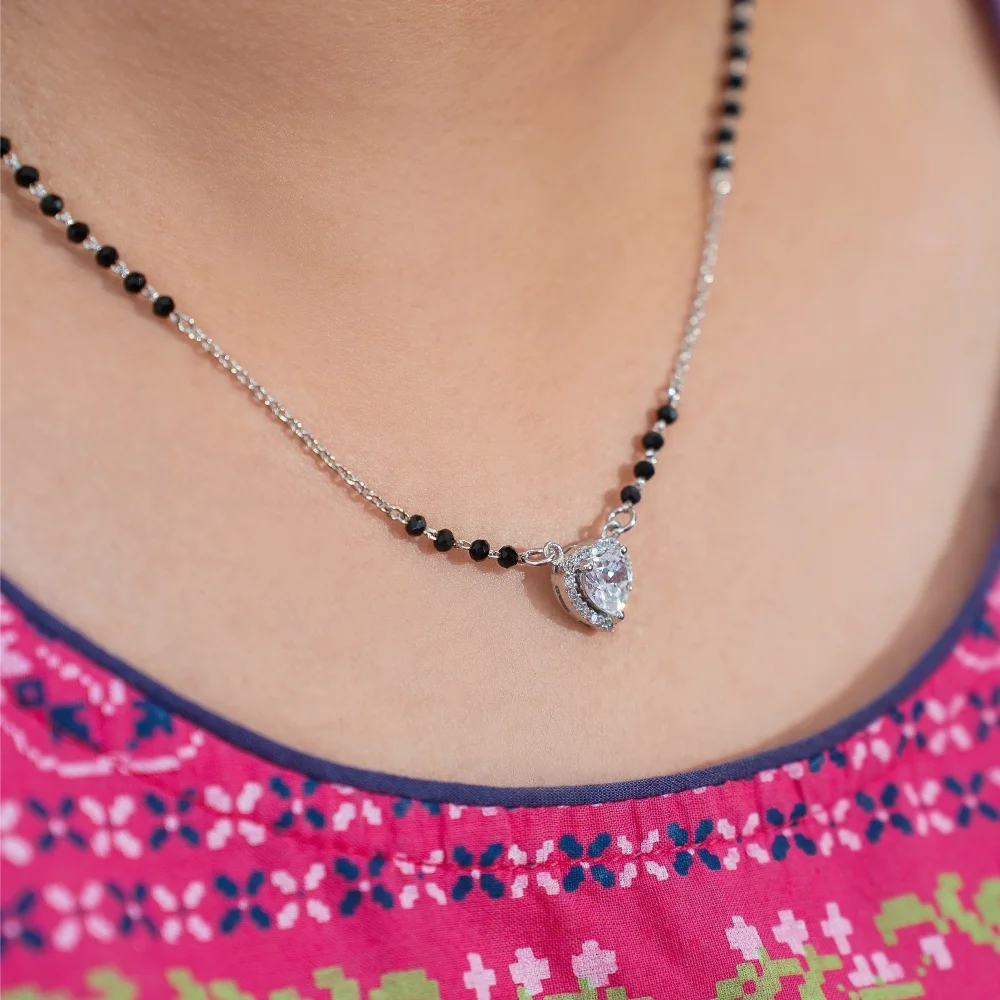 Blend timeless tradition with modern elegance in this Diamond Heart Mangalsutra. A silver-toned chain, accented with classic black beads, leads to a striking heart-shaped pendant. The centerpiece features a brilliant-cut clear stone surrounded by a halo of smaller sparkling stones, creating a radiant, eye-catching effect.