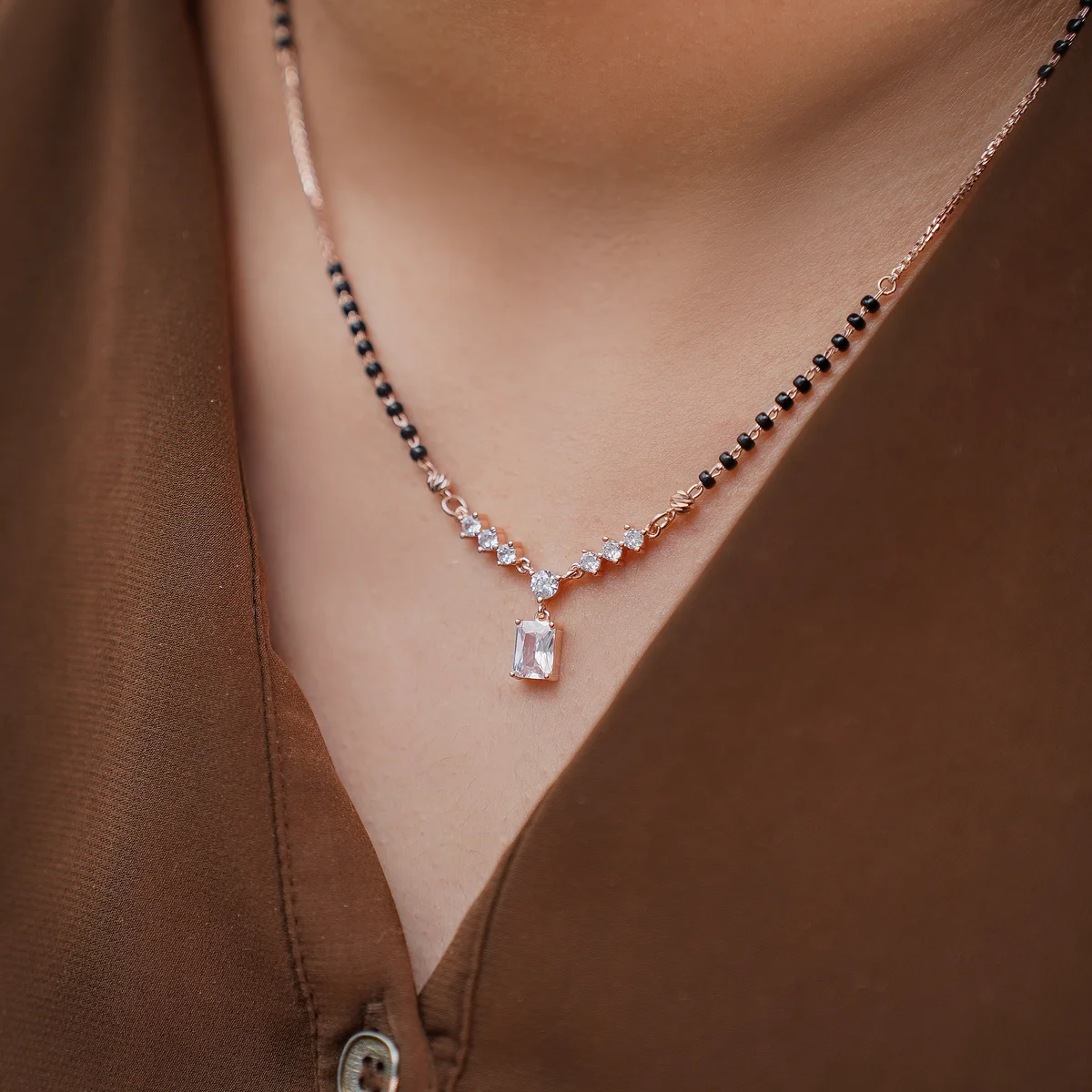 This striking Mangalsutra presents a sleek, linear design, offering a sophisticated and modern update to the traditional Indian mangalsutra. The piece is crafted with a fine rose gold-tone chain that is elegantly interspersed with the traditional small, glossy black beads along its length, giving it a warm, contemporary aesthetic. The chain also features small, scattered clusters of tiny, sparkling round stones, creating a delicate, floating look.