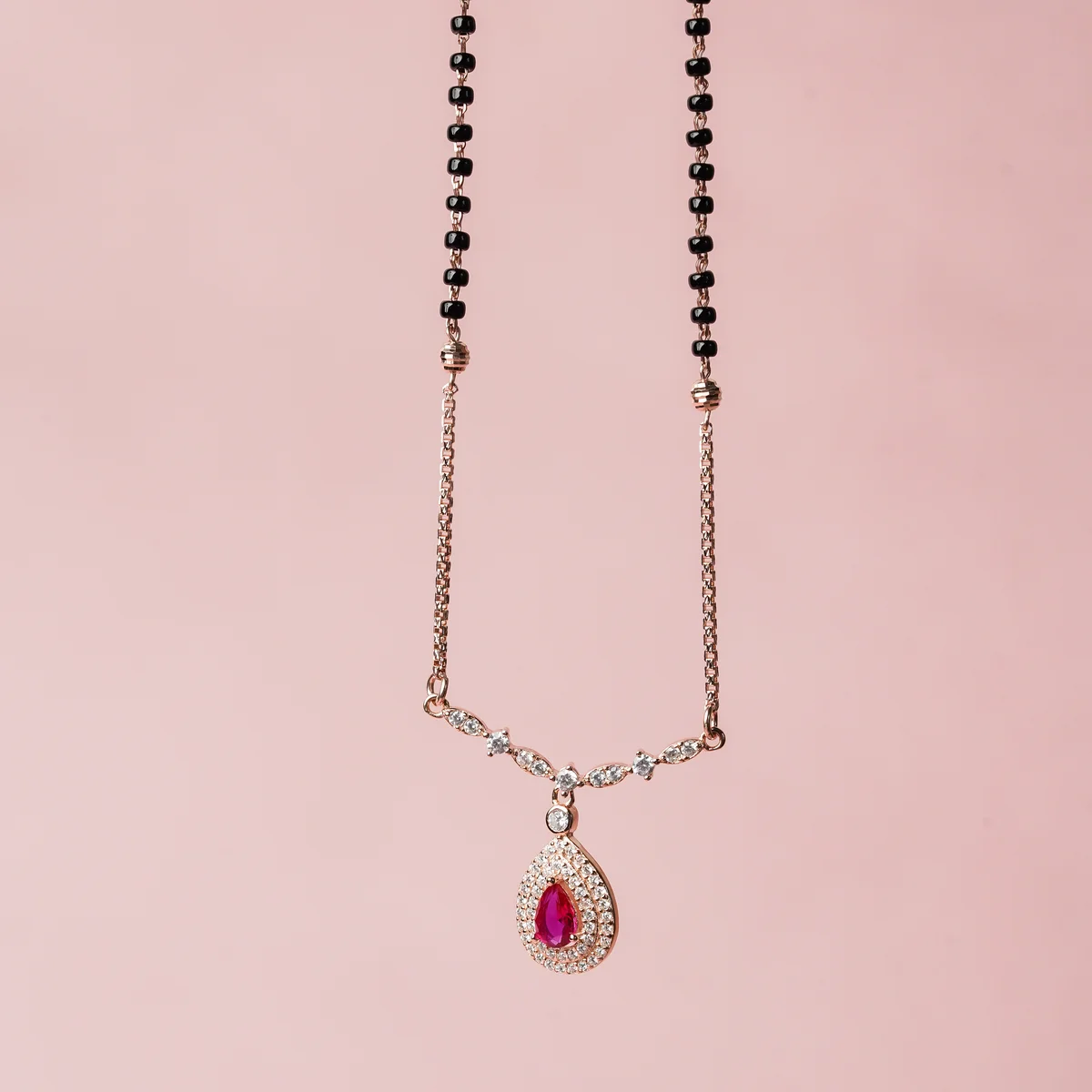 This is an elegant and eye-catching Mangalsutra with a touch of rich color! It uses the traditional black bead chain at the top. The pendant is a beautiful tear-drop shape set in sparkling rose gold. The center of the pendant features a large, bright red or pink stone surrounded by small, clear stones for extra shine. This piece looks very rich and royal. Why you will love it: Rich color: The red/pink stone makes this piece stand out from others. Elegant shape: The tear-drop design is classic and flattering. Special occasions: It is fancy enough for parties, festivals, and celebrations. This is a perfect piece when you want to wear tradition with a touch of luxury!