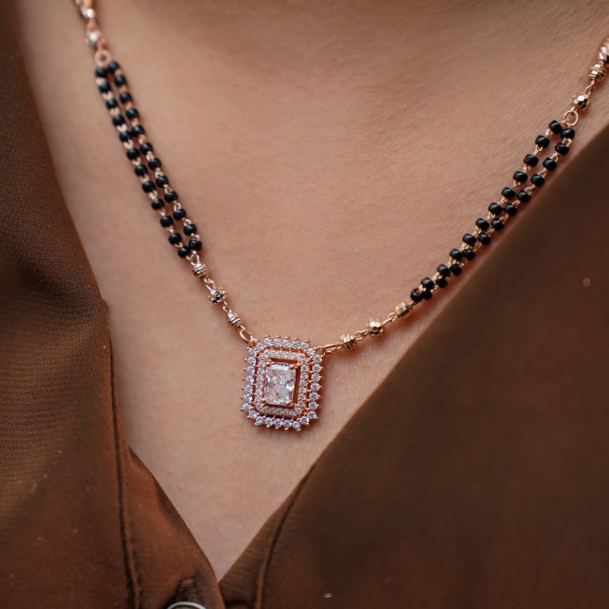 This Regal and opulent Mangalsutra is a luxurious take on the traditional Indian mangalsutra. The piece features an elaborate double-strand chain crafted from warm rose gold-tone metal, with the beautifully interspersed with the traditional small, glossy black beads. The rose gold chain also includes small, textured gold-tone beads, adding complexity and shine to the piece.