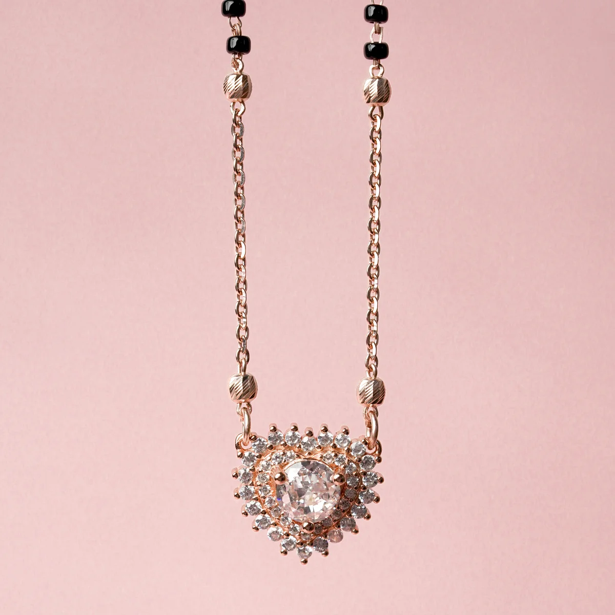 This is a bold and beautiful Mangalsutra that shows off a lot of sparkle! It uses the traditional black bead chain at the top. The pendant is a large, heart-shaped cluster of bright stones. A big stone is set in the center, surrounded by many smaller stones, all in shiny rose gold. This design is full of love and light! Why you will love it: Maximum sparkle: The large cluster of stones ensures it is highly visible and bright. Romantic style: The heart shape is perfect for showing love and commitment. High-quality look: The detailed setting makes it look very rich and expensive. Wear this piece when you want a strong, eye-catching, traditional statement!