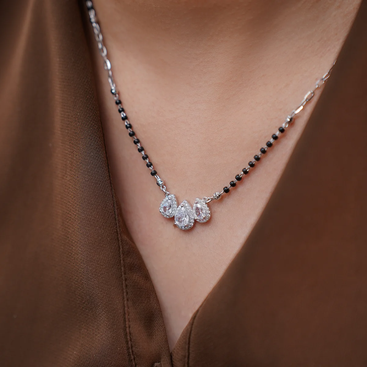 This elegant and sparkling Mangalsutra is a distinctive, modern interpretation of the traditional Indian mangalsutra. The piece features a fine silver-tone chain that is elegantly accented with the traditional small, glossy black beads interspersed along a significant portion of its length. The white metal gives the Mangalsutra a bright, contemporary appeal.