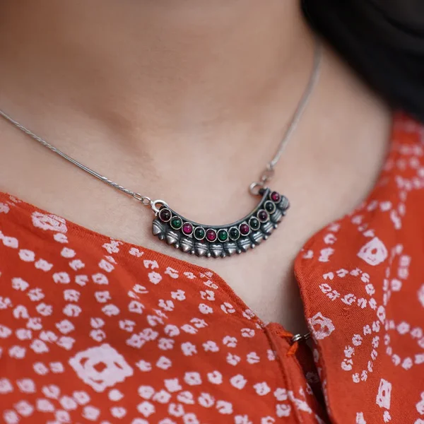 Add a touch of vibrant elegance with this Oxidised Silver Pendant with Ruby & Green Stones, designed for budget-conscious shoppers and trendsetters. This stunning pendant features a captivating design in oxidised silver, adorned with rich ruby and vivid green stones that create a striking contrast. Paired with a matching silver chain, it’s perfect for everyday wear or special occasions, blending vintage charm with modern flair. This affordable jewellery piece offers a luxurious look at a budget-friendly price. Elevate your collection with this elegant oxidised silver pendant and make a bold statement. Shop now to own this trendy accessory!