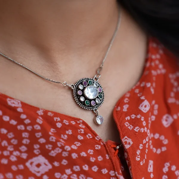 Oxidised Silver Round Pendant with White, Ruby & Green Stones