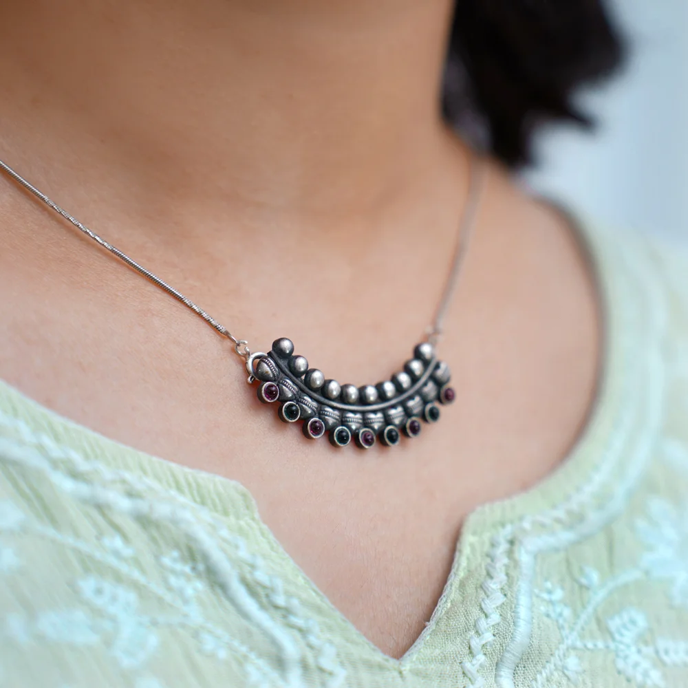 Embrace timeless charm with this stunning oxidized rainbow pendent, designed for those who love elegance with a touch of tradition. The necklace features a sleek silver-toned chain that gracefully holds a beautifully crafted oxidized metal bar pendant. The pendant is adorned with intricate dome-shaped detailing, creating a textured antique appeal. Only the pendant is included, not the chain.