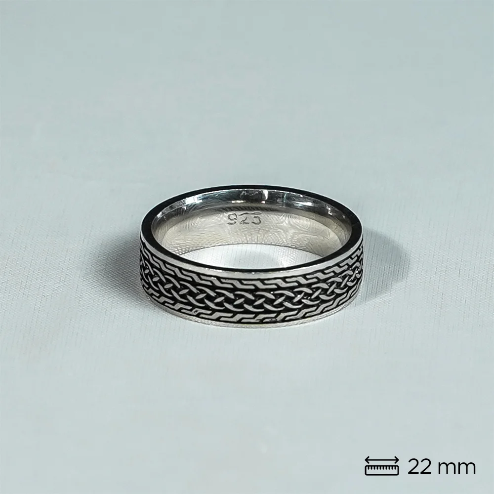 A handsome and distinctive band ring crafted from polished silver-tone metal. The entire outer surface is engraved with a continuous, rich Celtic knot pattern finished with an oxidized or black enamel fill to make the interlocking design stand out. This substantial band measures 22 mm across and is ideal for a wedding band or a meaningful statement piece.