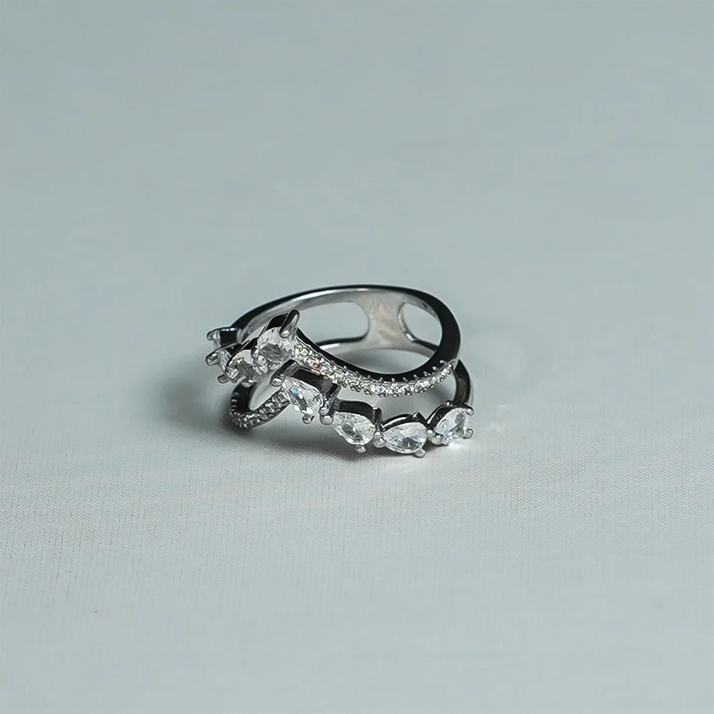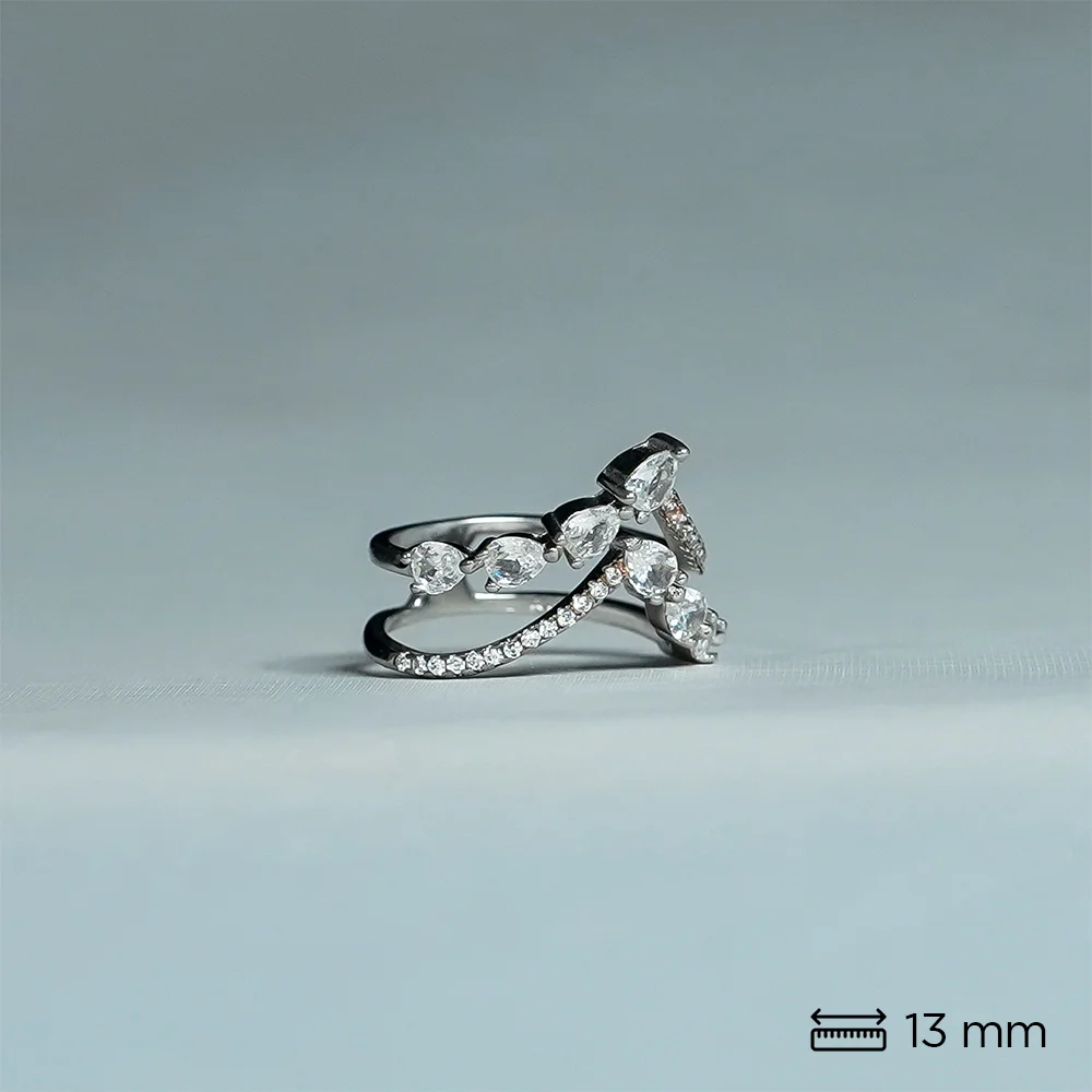 This bold, statement ring features a wide, multi-layered crossover band set in polished silver-tone metal. The design showcases various sizes of marquise-cut stones arranged in a dynamic flow, with one band paved with smaller, round accent stones.