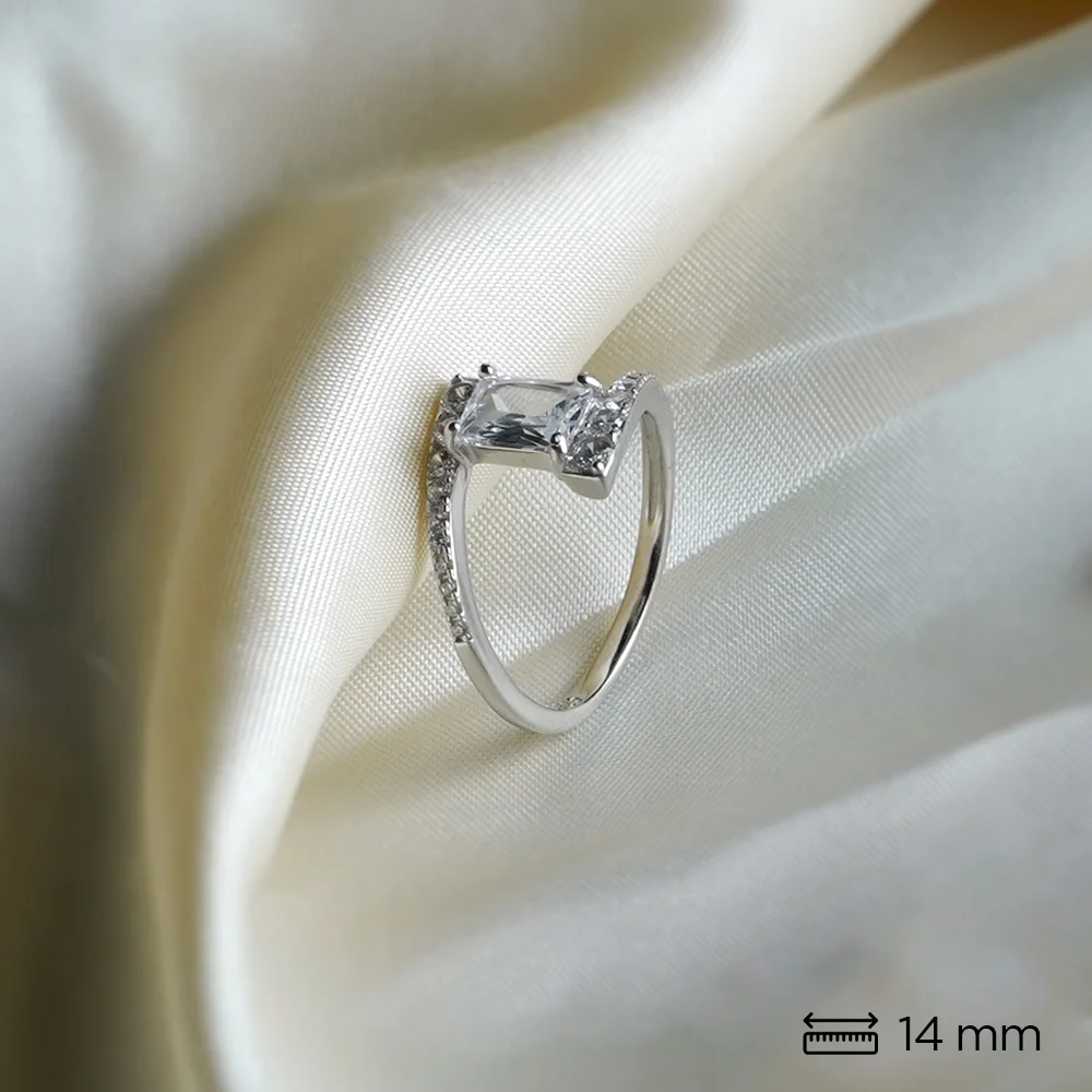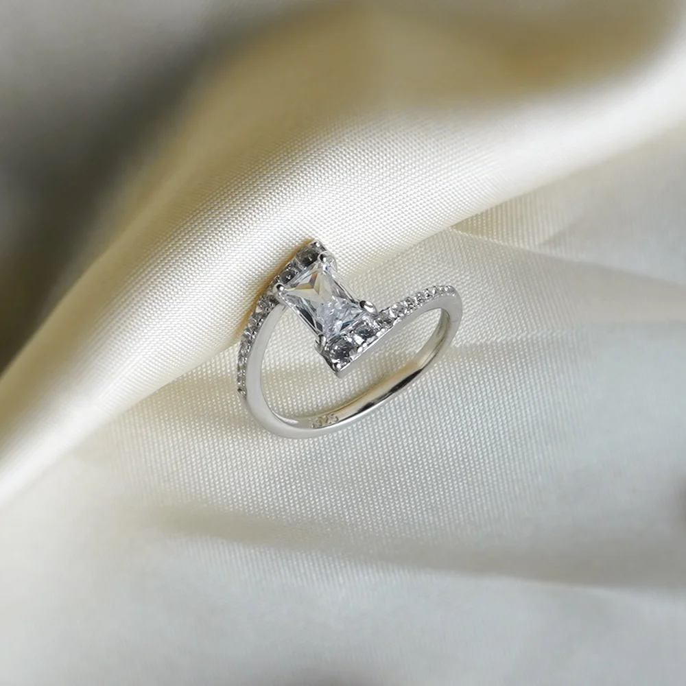 This sophisticated ring features a dynamic, bypass design in a polished silver-tone metal. The focal point is a large, vertically set emerald-cut center stone. The band gracefully wraps around the stone, forming an asymmetrical, twisting design on the shoulders, which are brilliantly paved with rows of small round-cut accent stones. It's a bold and modern piece with maximum sparkle.