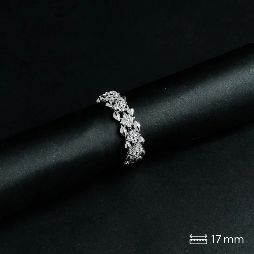 This striking, wide band ring features a continuous pattern of five clustered round stones separated by sparkling, geometric silver-tone connectors, creating the illusion of a full floral eternity band.