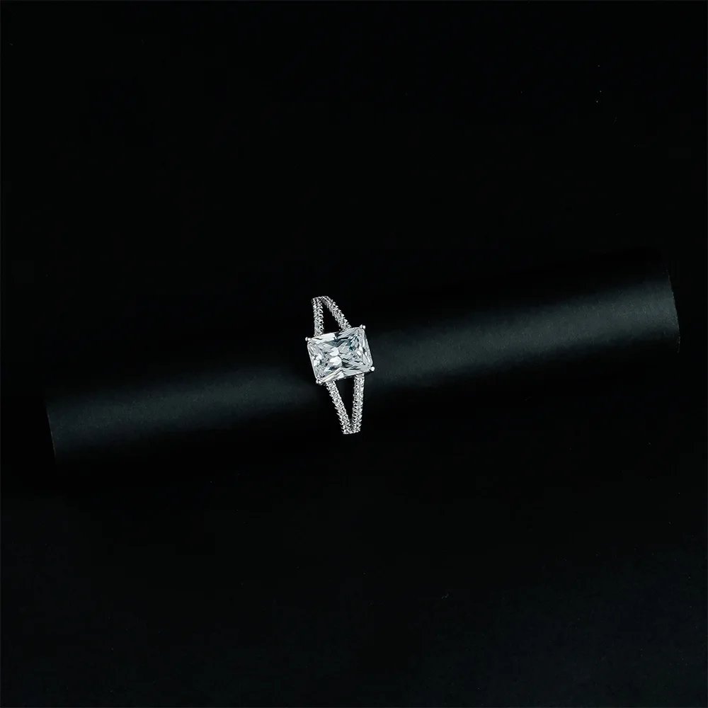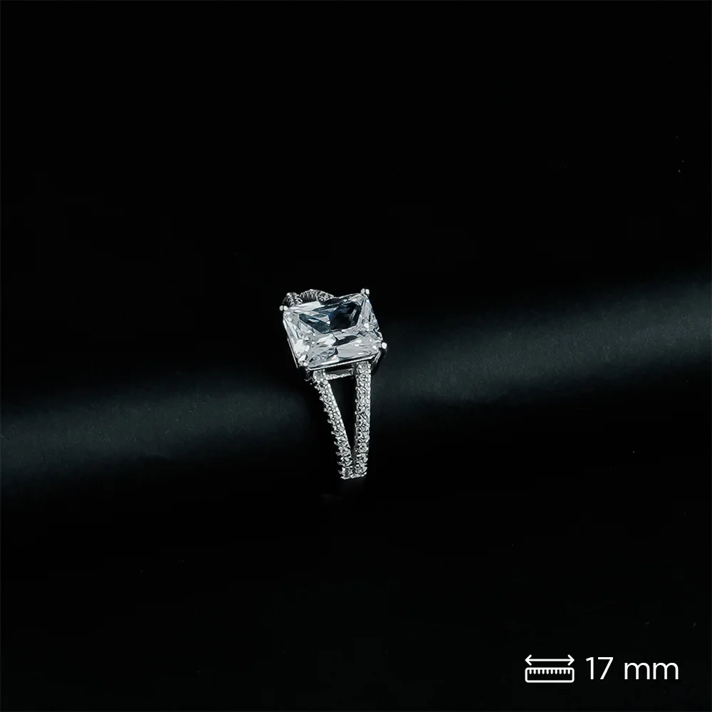 This magnificent ring features a substantial square or radiant-cut center stone set in a highly polished silver-tone metal. The dramatic effect comes from the split-shank band, where the two arms of the band are completely paved with accent stones, creating a wide, sparkling base for the solitaire.