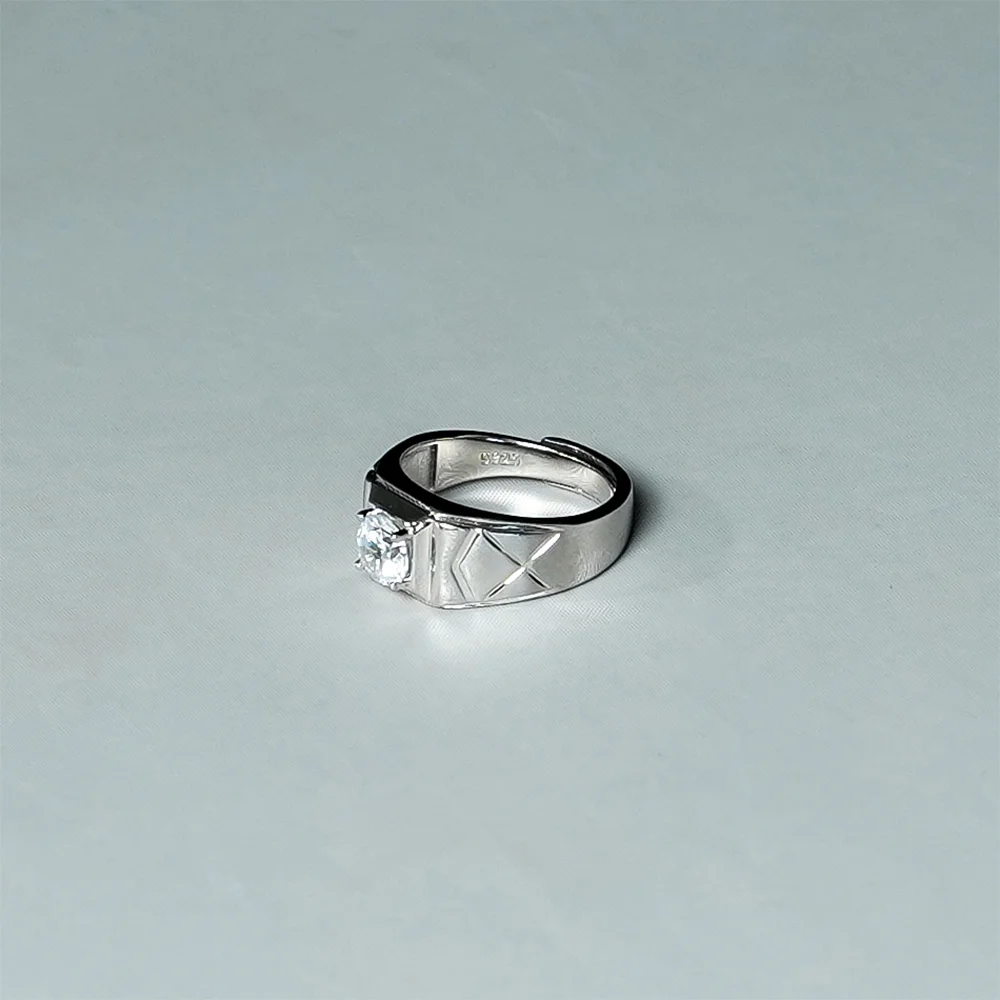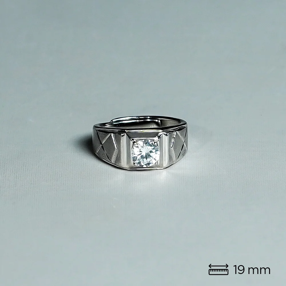 A bold, masculine ring set in silver-tone metal. The wide, polished band features deep, geometric-cut accents on the shoulders, flanking a central, substantial square-cut solitaire stone.