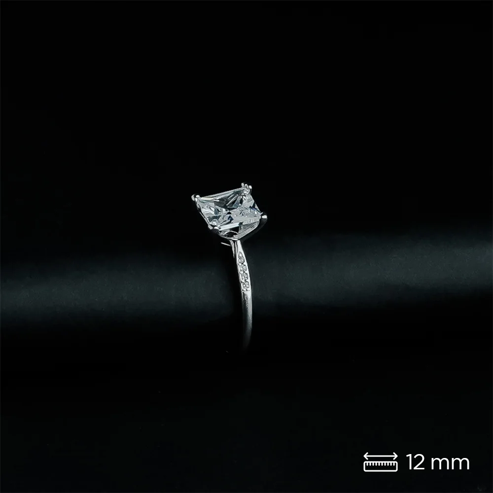 This elegant solitaire ring features a magnificent princess-cut center stone (a square brilliant cut) set with four prongs on a sleek silver-tone band. The band is delicately embellished on the shoulders with small, sparkling round accent stones, adding a subtle touch of fire to the classic design.