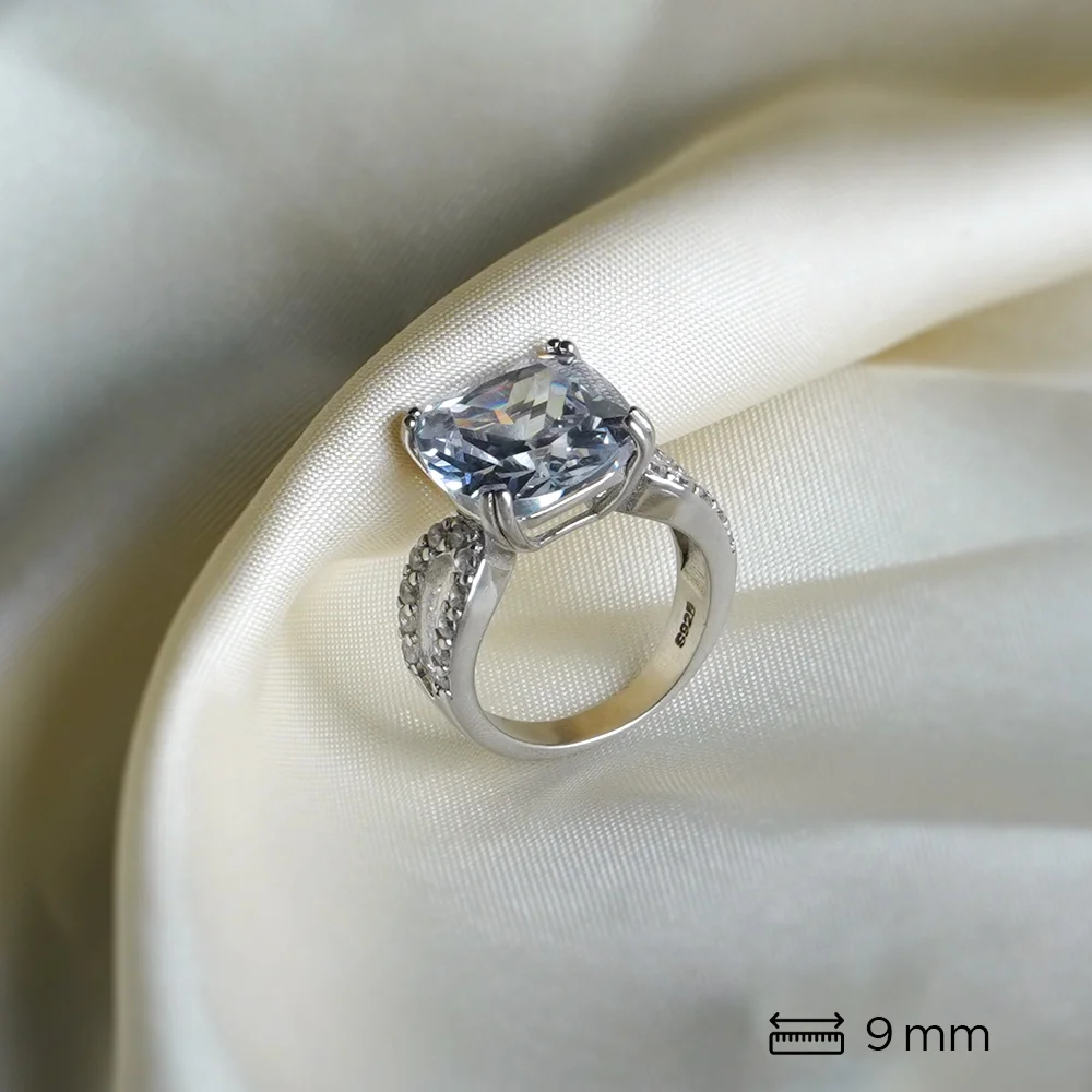 Command attention with the Sterling Silver Cushion-Cut Statement Ring. Featuring a brilliant cushion or princess-cut center stone and a triple row pave-accented band, this ring radiates exceptional sparkle and luxury. Crafted from polished sterling silver, it’s perfect as a show-stopping cocktail ring, luxurious right-hand ring, or special occasion gift.