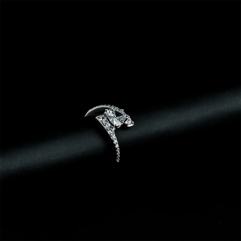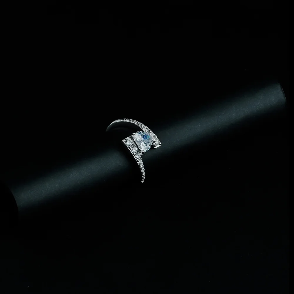This elegant and modern ring features a dynamic design in a polished silver-tone metal. The focal point is a brilliant heart-cut solitaire stone set slightly off-center. The band splits as it reaches the center stone, with one side of the band elegantly paved with accent stones, creating a beautiful, asymmetrical wrap.